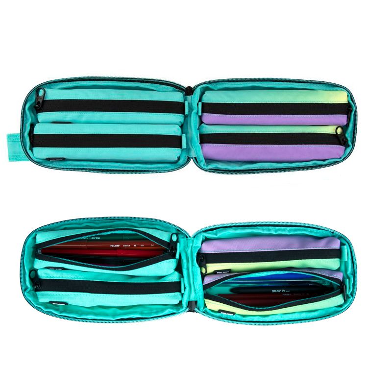Kit 4 estuches con contenido, que permite mantener el material escolar siempre ordenado y de fácil acceso. Los 4 estuches interiores se pueden extraer y volver a colocar. Serie Sunset, color turquesa. Una combinación de colores degradados inspirados en el atardecer, acompañados de detalles en blanco y negro. Tiradores de las cremalleras con cuerda. Con 2 estuches interiores de color verde y 2 de colores degradados. Material escolar incluido: 1 goma de borrar nata® 320 Sunset amarilla, 1 sacapuntas AFILA, 1 lápiz de grafito HB, 3 bolígrafos CAPSULE (verde, negro y rojo), 1 regla de 15 cm, 12 lápices de colores y 12 rotuladores de punta cónica. Tejido 'ripstop': ligero y resistente a la rotura y rasgaduras. Utiliza una técnica especial que teje hilos gruesos de refuerzo a intervalos regulares en un patrón entrecruzado. Composición tejido: exterior y forro interior de poliéster.