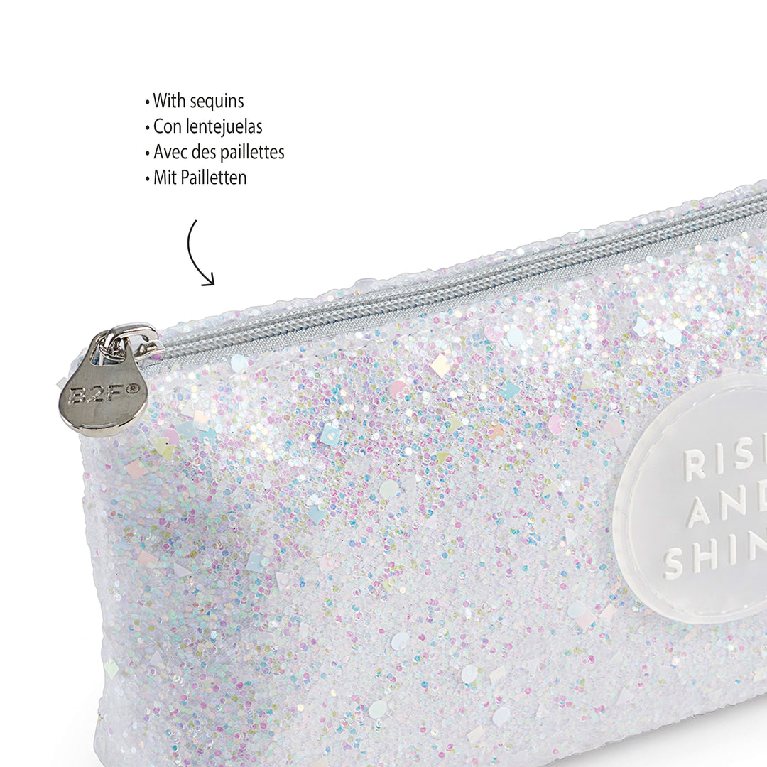 Estuche triangular con purpurina de color blanco. Con mensaje motivador: "Rise and Shine". Venta individual. Material: poliéster con purpurina.