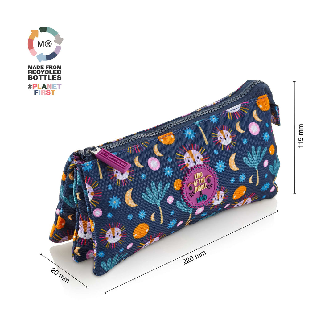 Este portatodo triple King Of The Jungle une diversión y conciencia ecológica con su exterior de RPET reciclado. Decorado con dibujos vibrantes del rey de la jungla, el león, que resaltan sobre un fondo oscuro, aporta un toque salvaje y original. Su interior de poliéster resistente mantiene tus útiles organizados y protegidos, ideal para quienes buscan estilo y orden con un guiño a la naturaleza.