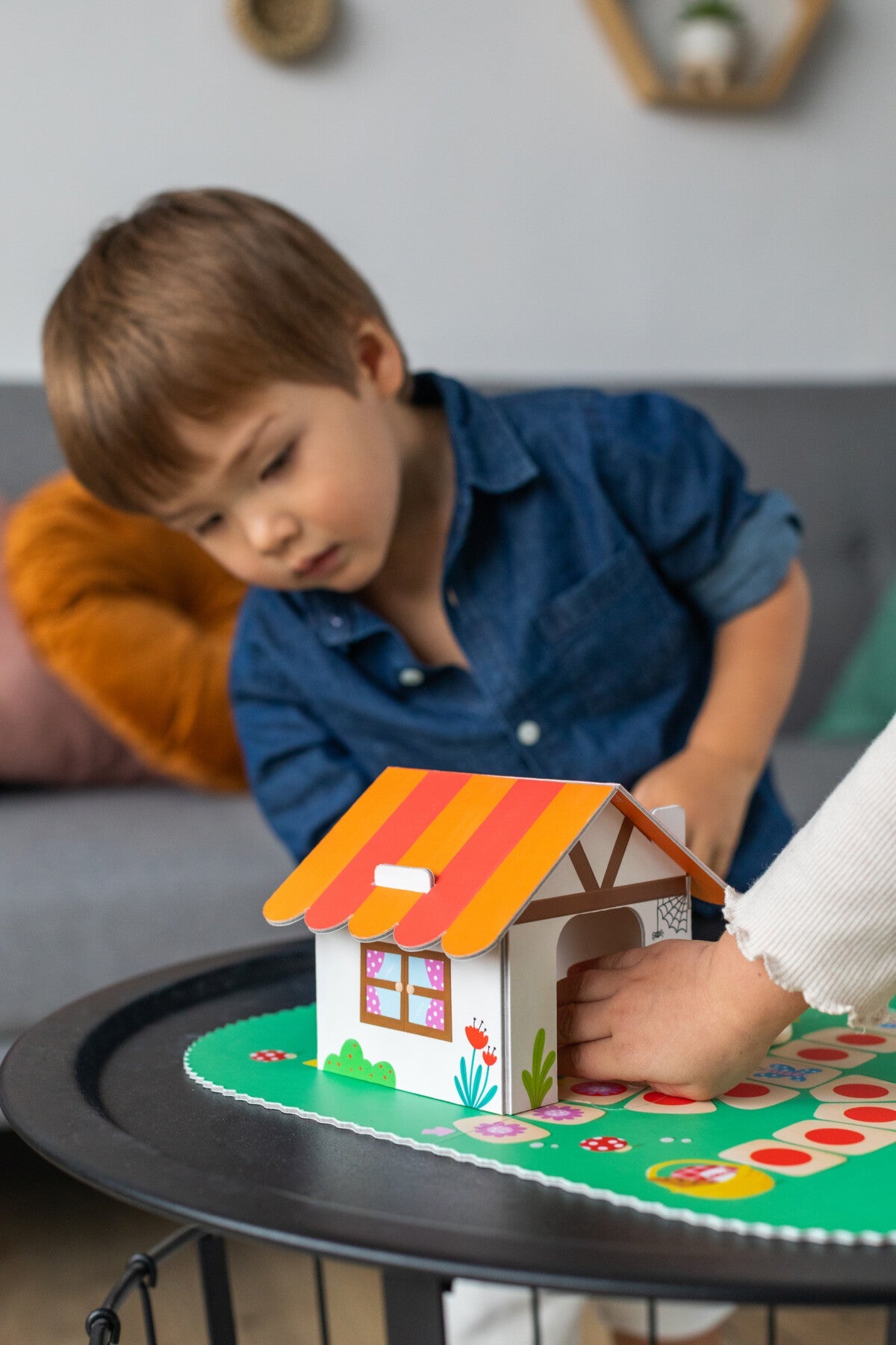 Tablero puzle, 1 casita 1 dado y 6x piezas árbol 3 fichas: 1x caperucita, 1x lobo y 1x abuelita Instrucciones
