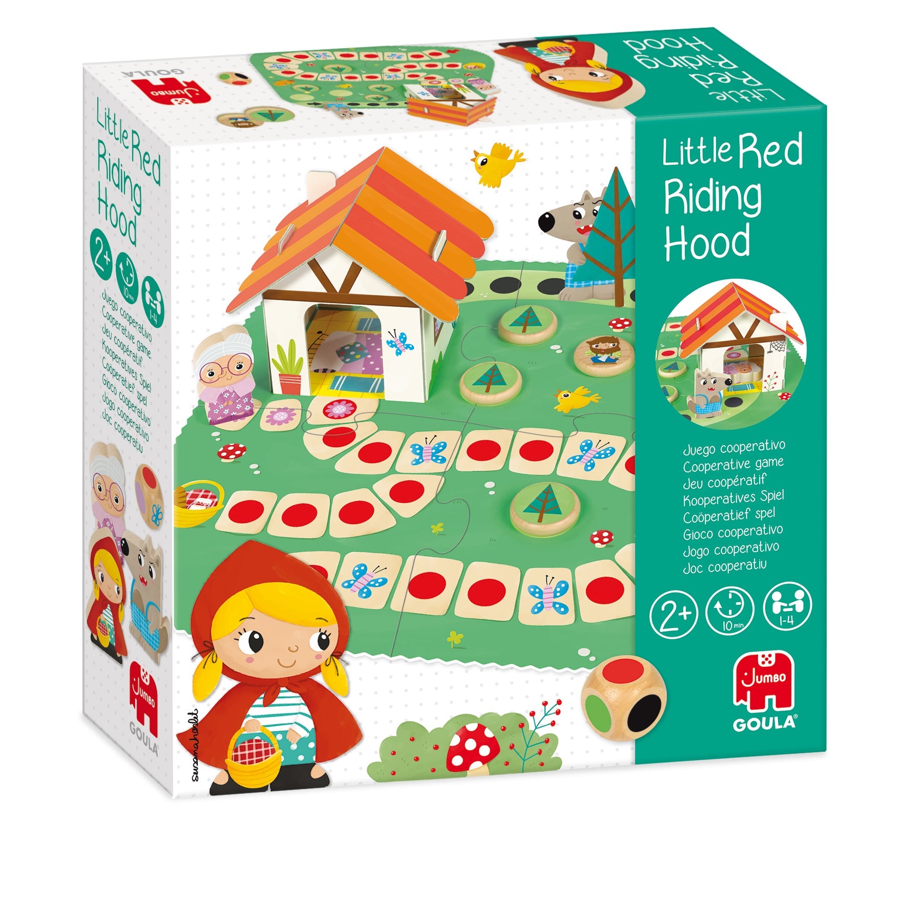 Juego de mesa preescolar ilustrado del conocido cuento infantil “La caperucita roja”. El juego tiene dos modalidades distintas: Cooperativa: En el que todos los niños juegan juntos para intentar que la caperucita llegue antes que el lobo a casa de la abuelita, así que, en cada turno los movimientos que hagan según lo que saquen con el dado tendrán que hacerle avanzar para ello. Competitiva: versión para dos jugadores, uno de ellos es el lobo y el otro la caperucita, el jugador que llegue antes a casa de la abuela gana la partida.