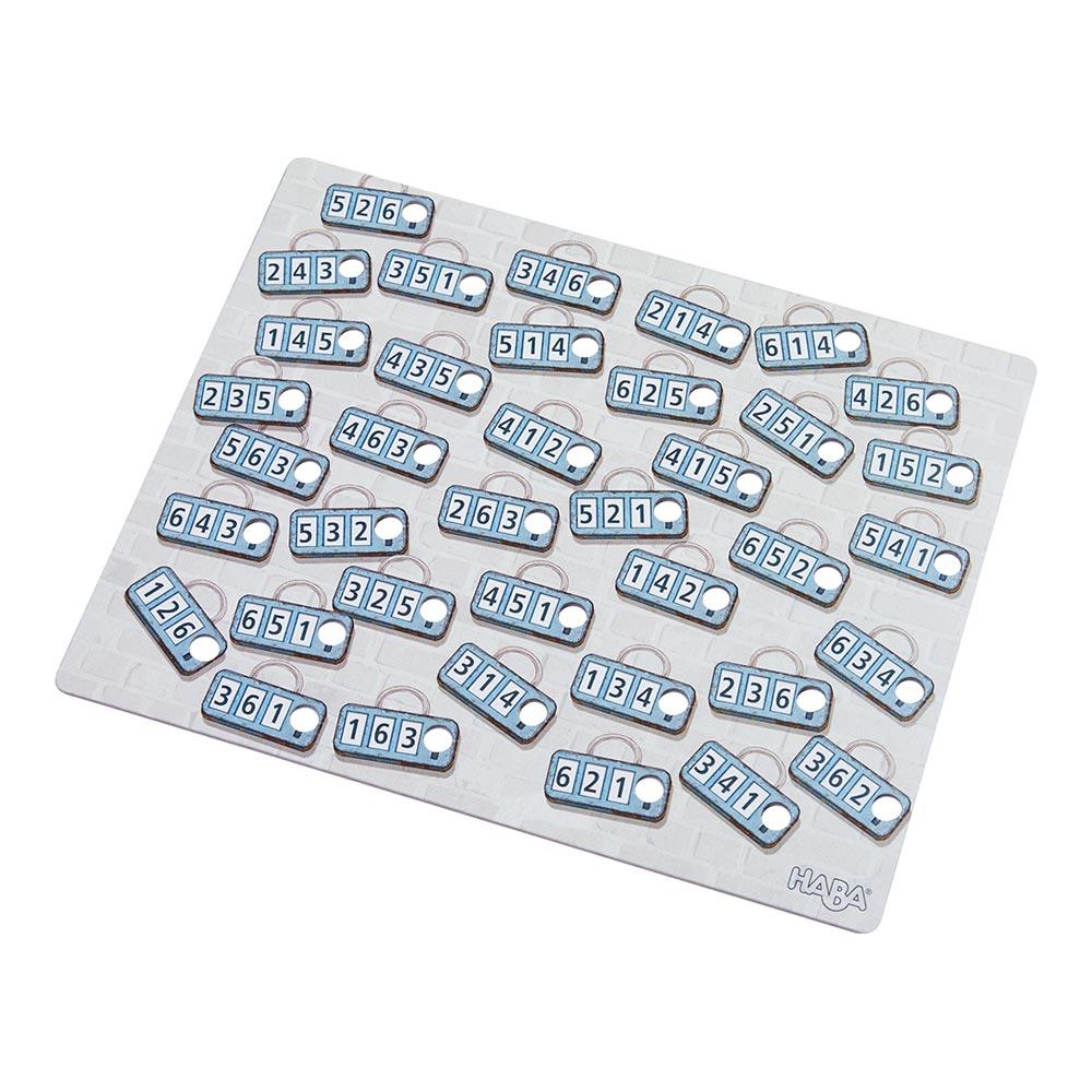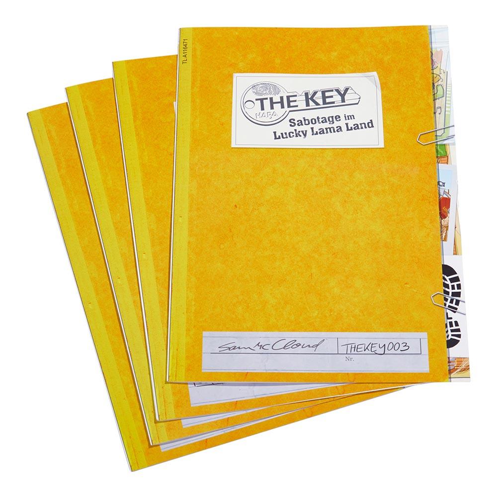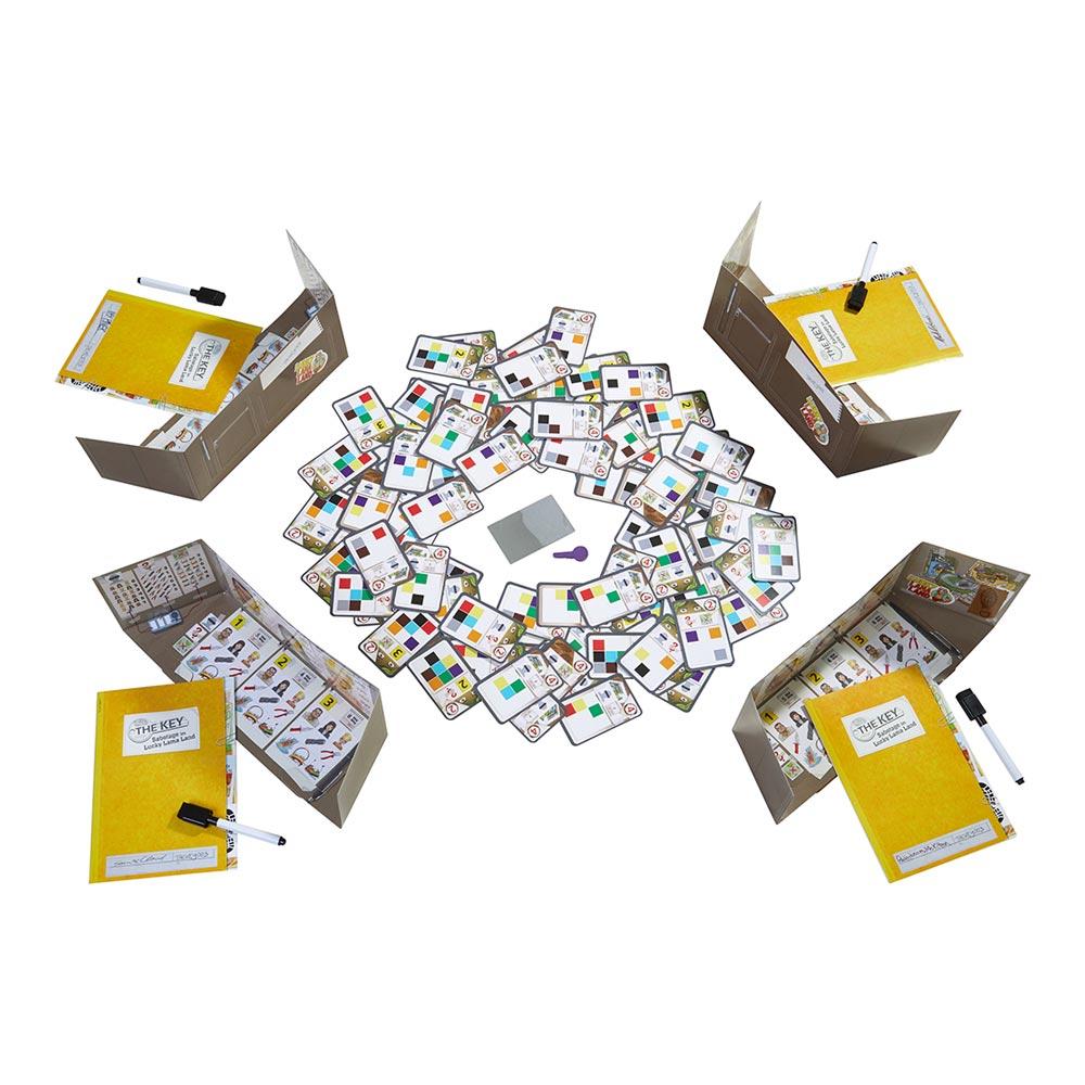 La caja contiene: 4 maletines-pantalla, 4 expedientes de investigación, 9 llaves de madera, 1 carta espejo, 1 tablero de soluciones, 4 rotuladores con borrador, 140 tarjetas y guía de juego.
