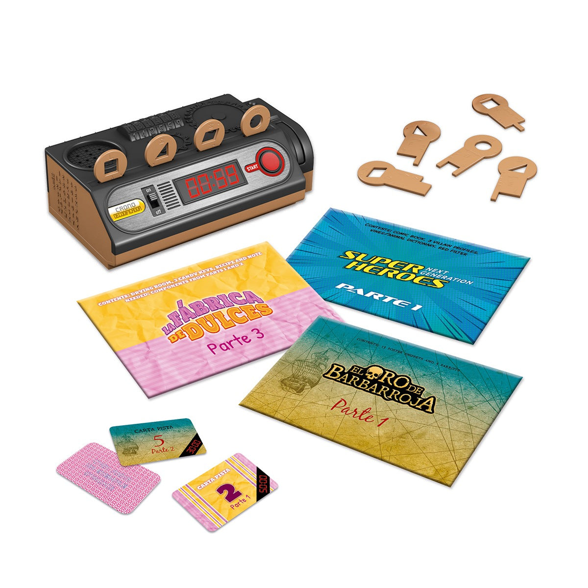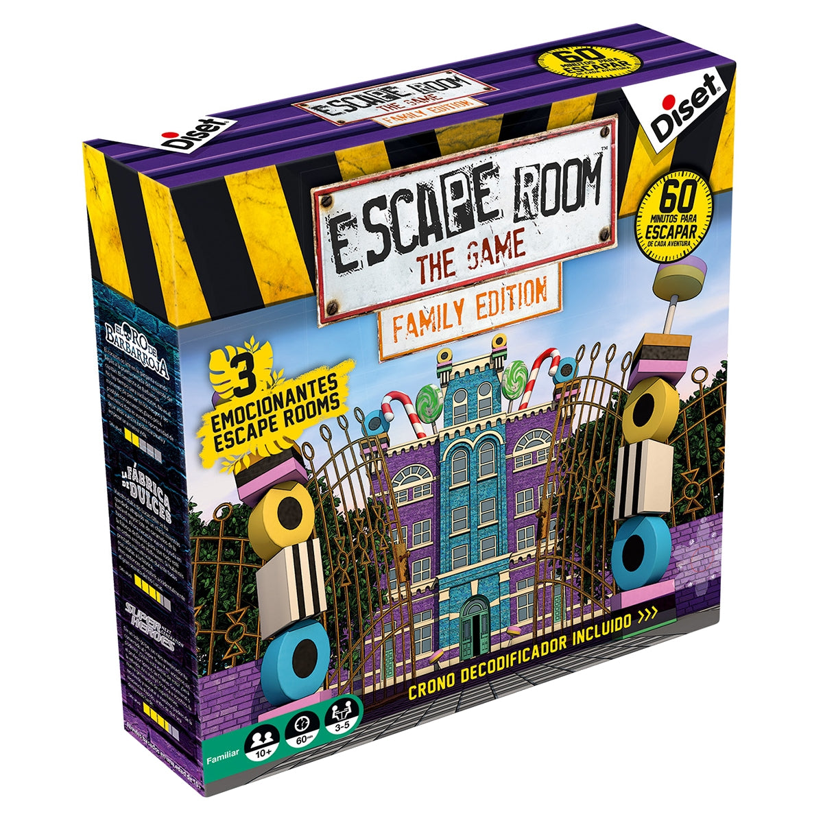 Escape Room Family Edition Exclusiva de Diset: un juego de mesa para 3 a 5 jugadores que trae la emoción de una sala de escape a tu hogar. Resuelve enigmas y supera desafíos en 60 minutos mientras disfrutas de aventuras temáticas como Las leyendas de Barbaroja, Candy factory y Super héroes.