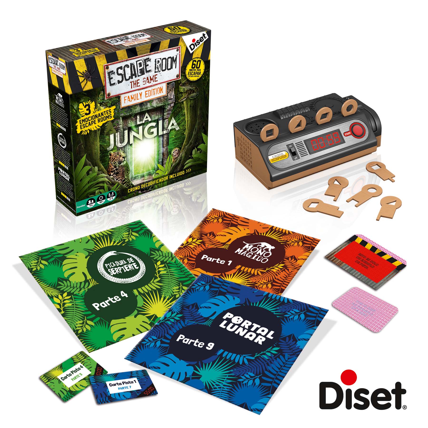 -16 llaves -decodificador de pistas -3x8 cartas de pistas -crono decodificador electrónico -instrucciones -3 aventuras en la jungla: Mono Mágico, Bocado de serpiente y portalunar.