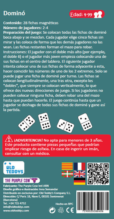 Clásico juego de dominó, ahora en un formato especial en caja de lata, ideal para llevar a cualquier parte y jugar mientras estamos de viaje en el coche. El objetivo de este juego es lograr ser el primero en quedarse sin fichas de juego. Para ello, por turnos iremos colocando una de nuestra fichas en el centro, de forma adyacente a otras fichas que ya estén descubiertas, formando así una fila de fichas encadenadas. Para poder colocar una ficha, uno de sus extremos debe coincidir con alguna de las 2 fichas destapadas. Un divertido juego para dos jugadores con el que trabajar la observación, la atención y el razonamiento lógico, al tiempo que permite divertirse en los trayectos por carretera. La caja sirve de tablero de juego y las instrucciones están impresas en la misma.