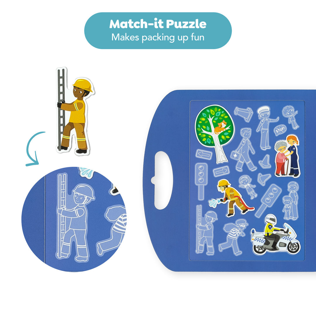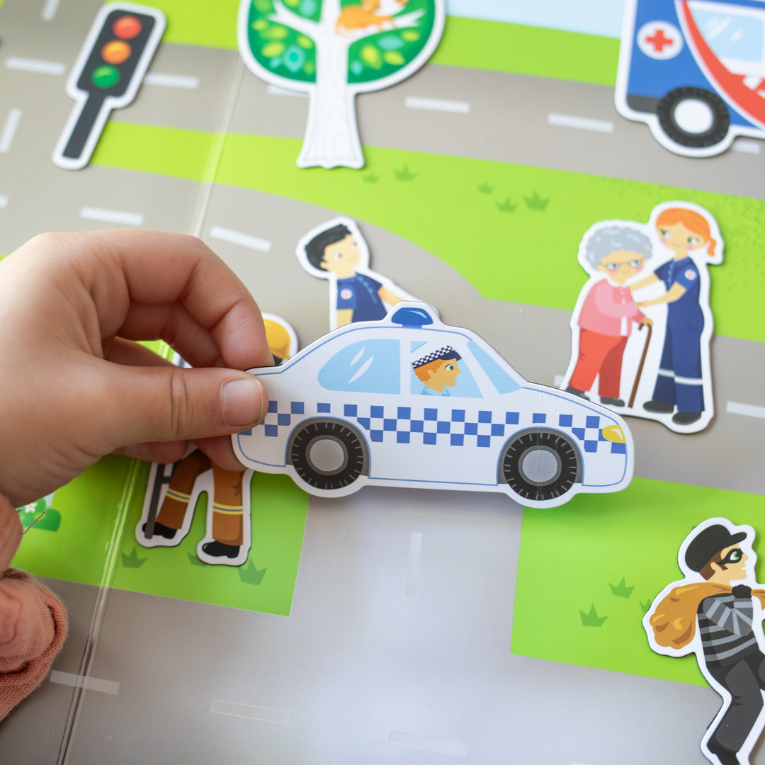 Evita desastres, salva gatitos, combate incendios y gestiona el tráfico con Magna Carry - Rescate de Emergencia de Tiger Tribe. Crea una nueva escena cada vez que juegues. Y cuando termines, ¡recoger es divertidísimo con el rompecabezas de "une las piezas magnéticas" del estuche! ¡Listo!