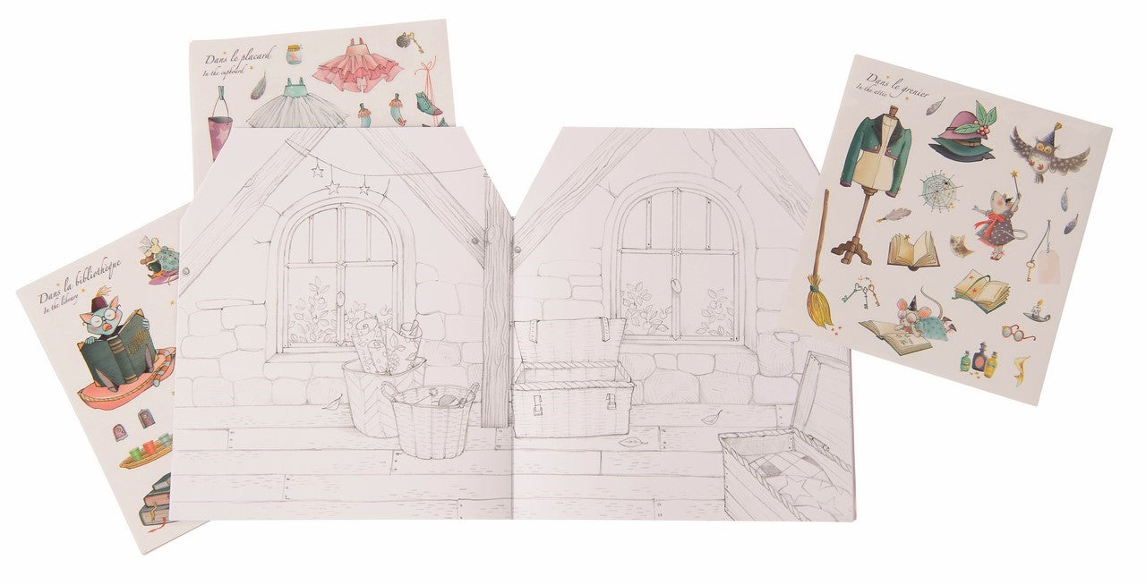 Para pintar y pegar stickers - Cuaderno en forma de casa con láminas de pegatinas.