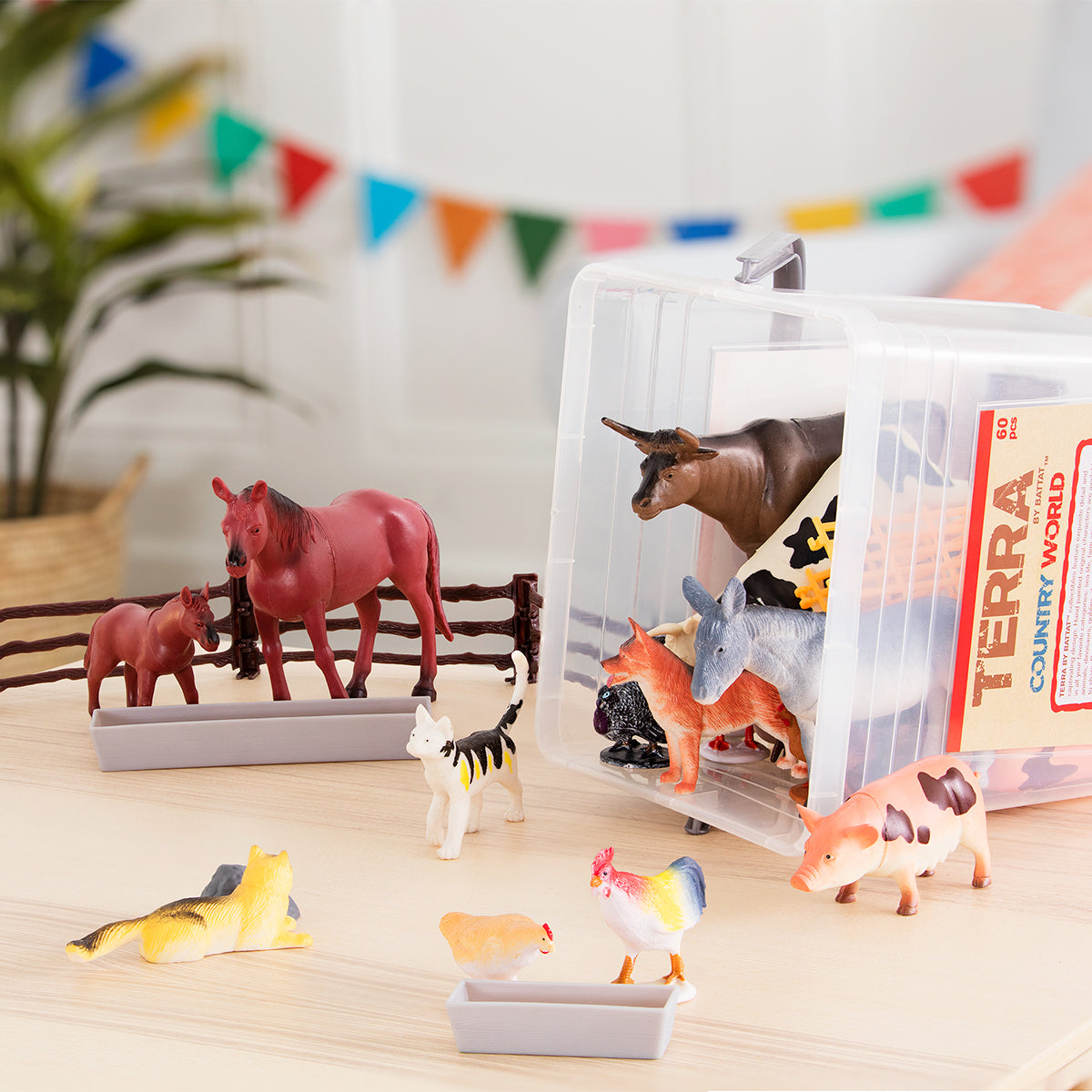 ¡Trae la vida en la granja a casa con el set de juego Country World de Terra by Battat! Este encantador cubo contiene 24 figuras detalladas de animales de granja, como vacas, cerdos, caballos, gatos, gallos y un adorable perrito. ¡Pero eso no es todo! Crea escenas imaginativas o dioramas con 34 accesorios aprobados por granjeros, perfectos para el juego de simulación. El esculpido realista captura la personalidad de estos amigos de la granja en un diseño sólido y duradero, creado para años de juego. Estas figuras de animales también pueden ayudar a enseñar e inspirar a los niños sobre la vida en la granja y fomentar la compasión por los animales. Es el set completo perfecto para horas interminables de juego creativo o para ampliar una colección. Los animales de Terra también son ideales para fiestas de cumpleaños temáticas, para añadir a cajas sensoriales y como obsequios de fiesta. El resistente cubo con asa y tapa facilita su almacenamiento y transporte.