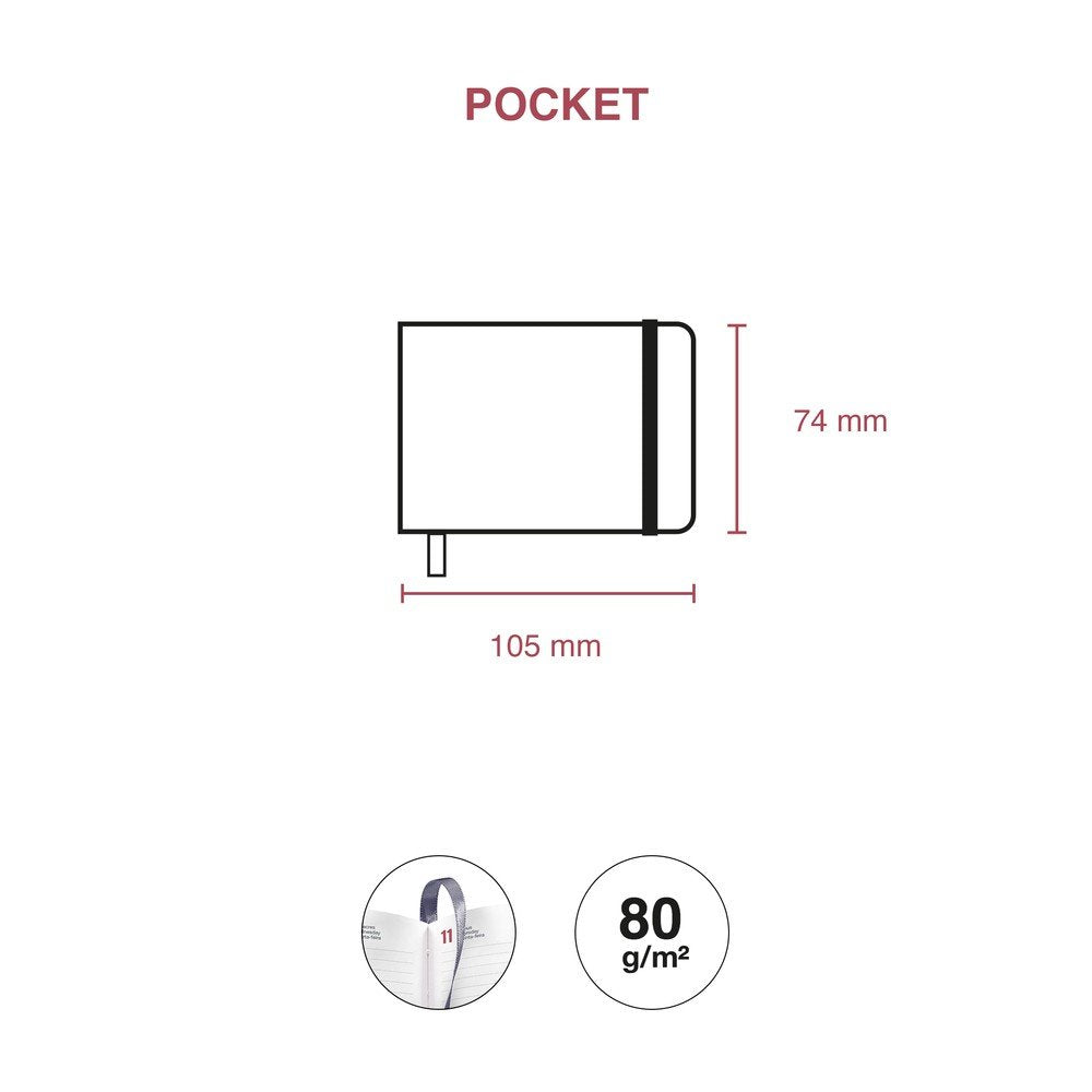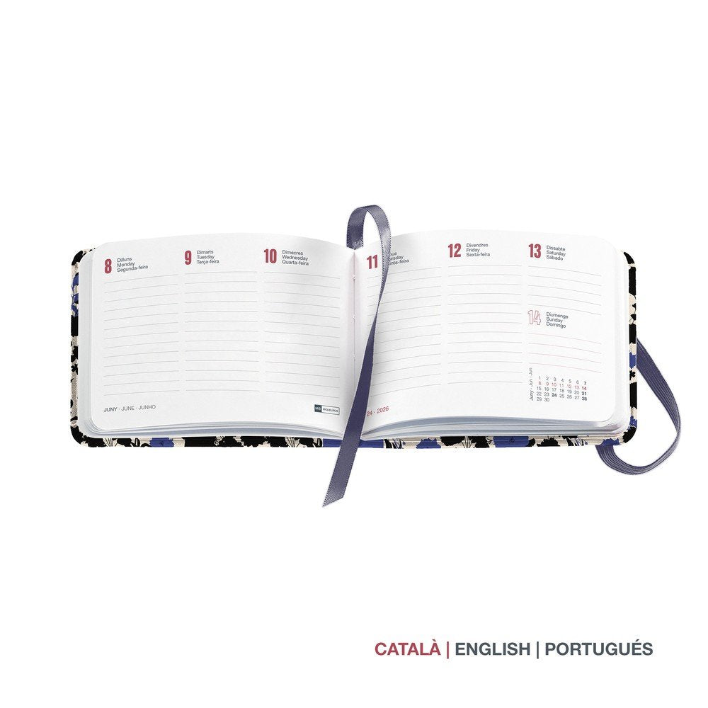 Cubiertas cosidas rigidas de cartón forrado, plastificado mate. Papel color marfil de 80 g/m², FSC Mix Credit. Tamaño: Pocket 105 x 74 mm. Anualidad: Semana a la vista horizontal (S/V), de Enero a Diciembre 2026. Idiomas: Catalán - Inglés - Portugués. Encuadernación cosida con cinta marcador. Bolsillo interior. Goma elástica para cerrar. Goma portabolígrafos. Contenido: Anualidad semana a la vista, datos personales, calendarios 3 años, planning mensual y hojas para notas. En versión catalán: Festivos Cataluña y sus capitales de provincia.