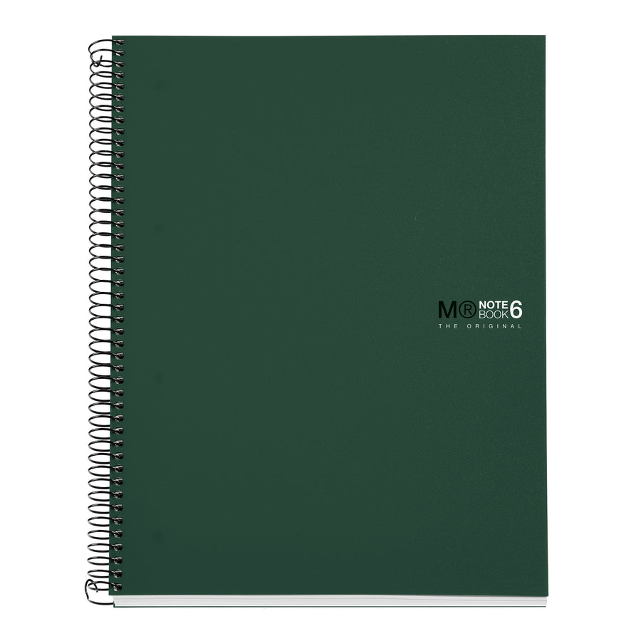 Cuaderno Miquelrius, tamaño A4 (210 x 297 mm). Cubiertas: Polipropileno opaco de 0,8 mm, ligero y resistente. Espiral: Metálica continua que permite la apertura en plano del cuaderno, además de dar la vuelta completa, y con cierre coilock que evita enganches. Papel interior: extra opaco de 70 g/m², evita que la tinta traspase y seca rápidamente. Hojas: 150 hojas con banda de color en el lateral (6 colores, 25 hojas por color), ideales para poder clasificar apuntes y usar un color para cada asignatura; cabecera para títulos; microperforado para un arranque limpio y 4 taladros para archivar.