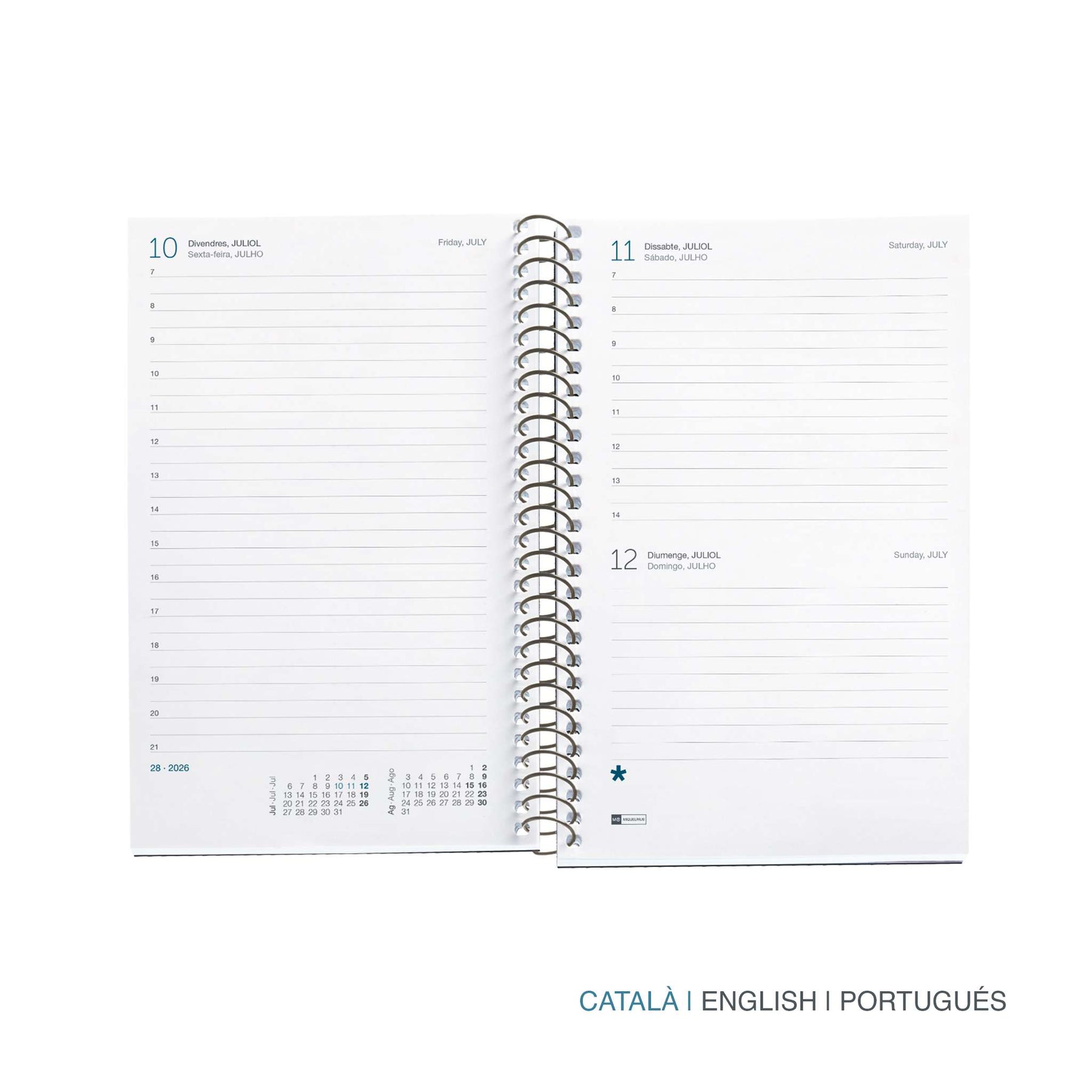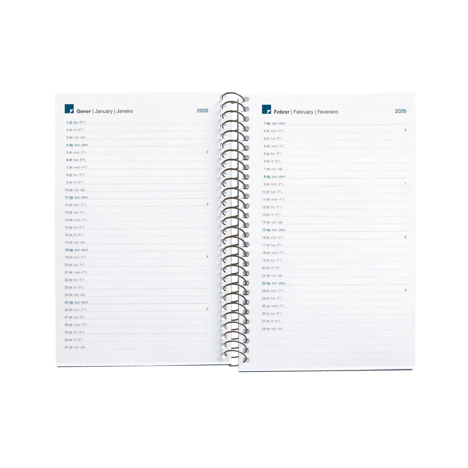 Cubiertas espiraladas de cartón forrado y plastificado mate. Papel color marfil de 80 g/m², FSC Mix Credit. Tamaño: Activa 117 x 182 mm. Anualidad: Día por página (D/P), de Enero a Diciembre 2026. Idiomas: Catalán - Inglés - Portugués. Encuadernación espiral. Hojas microperforadas en la esquina para señalar la fecha actual. Goma elástica para cerrar. Contenido: Anualidad día por página (sábado y domingo en una misma página), hoja de datos personales, recomendaciones, calendario bimensual en cada doble página, hojas para notas, hojas para direcciones. Festivos nacionales. Iconos que indican: cambio horario, inicio estaciones, año nuevo chino, carnaval y lluvia de estrellas (entre otros). En versión catalán: Festivos Cataluña y sus capitales de provincia.
