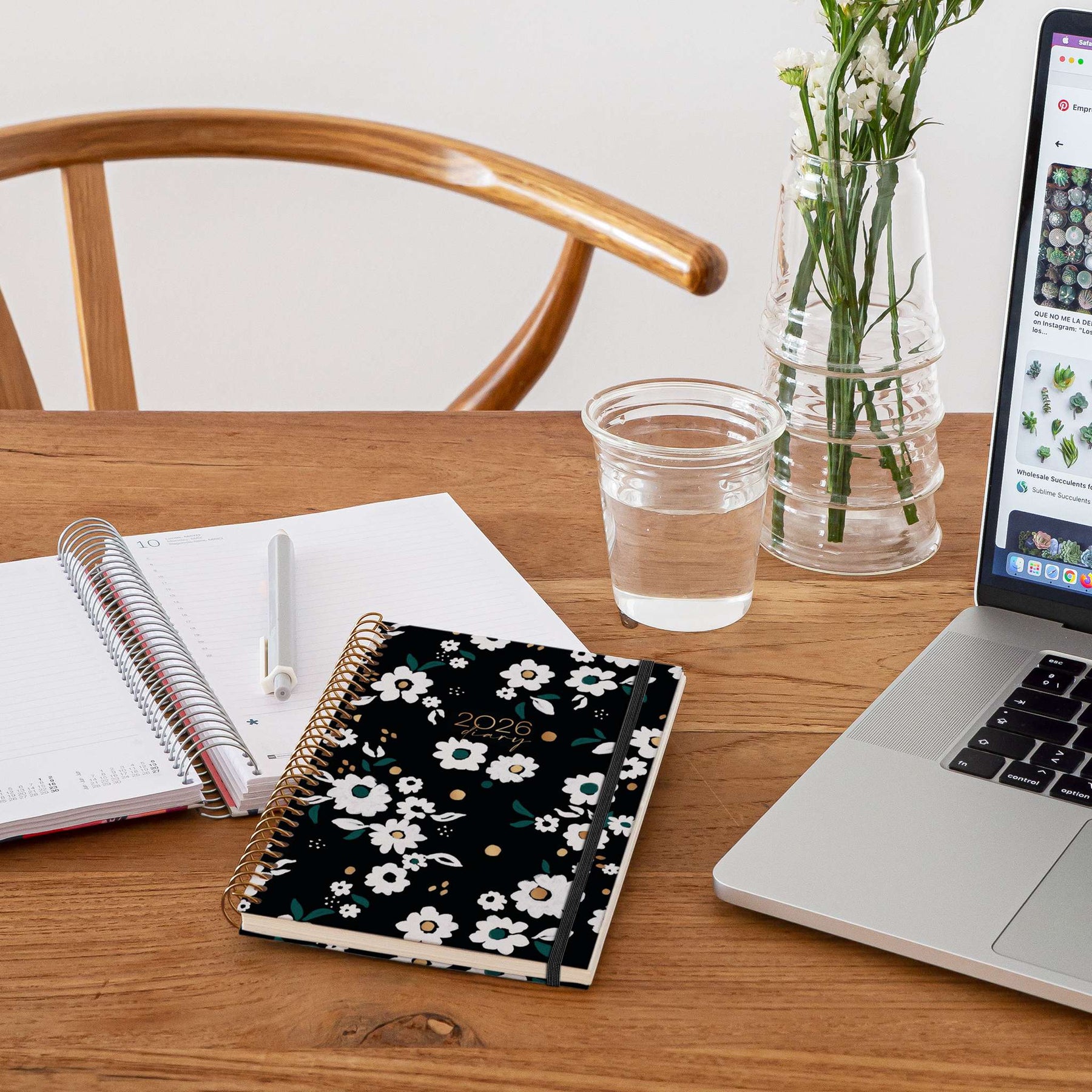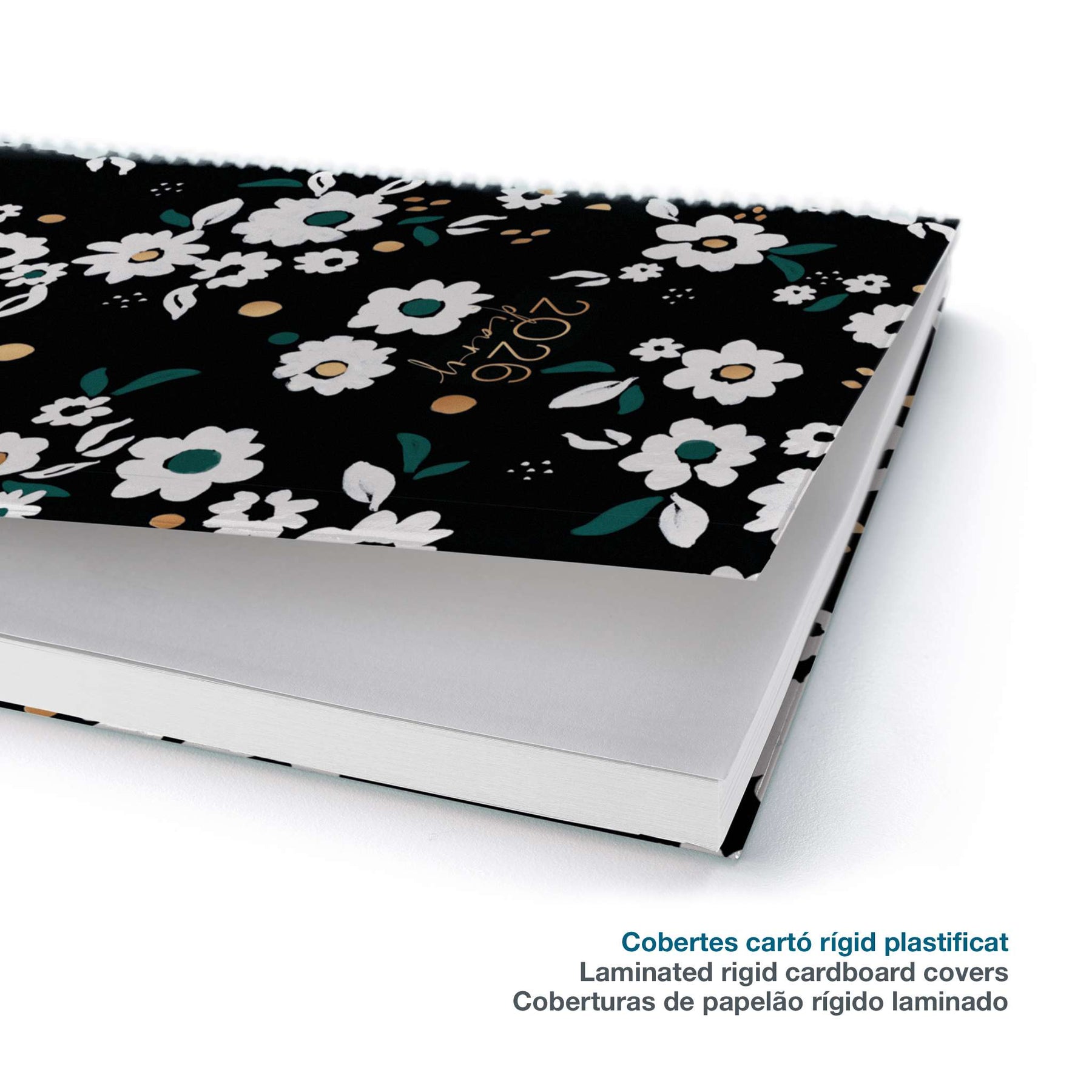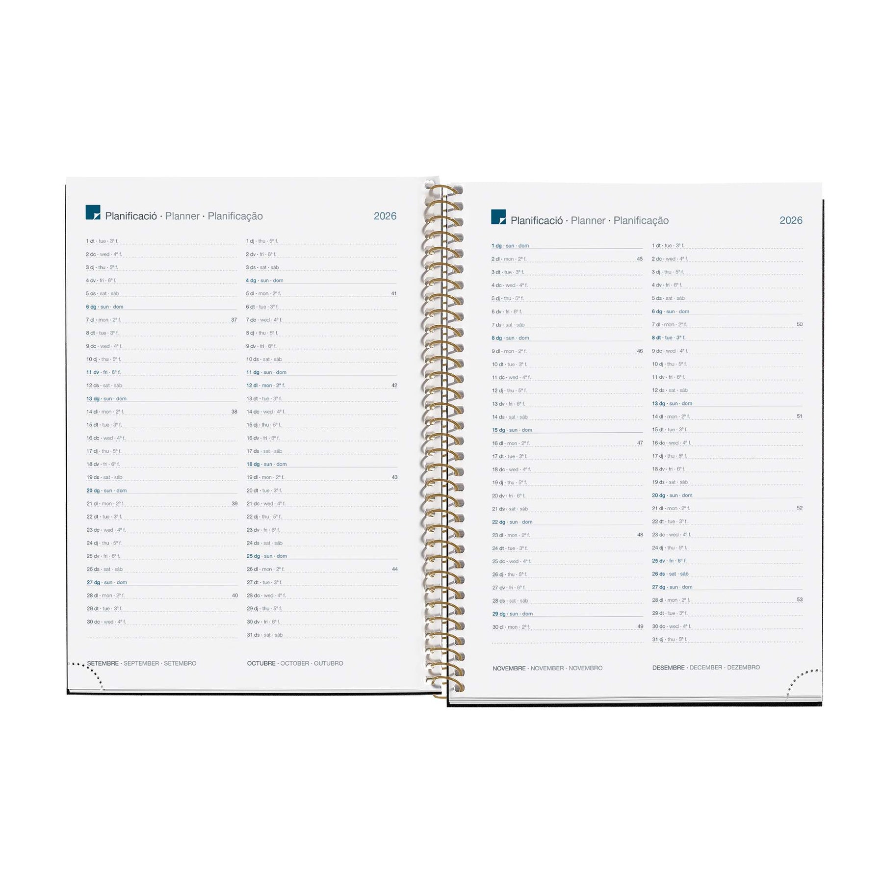 Cubiertas espiraladas de cartón forrado y plastificado mate. Papel color marfil de 80 g/m², FSC Mix Credit. Tamaño: Plus 155 x 213 mm. Anualidad: Semana a la vista horizontal (S/V), de Enero a Diciembre 2026. Idiomas: Catalán - Inglés - Portugués. Encuadernación espiral. Hojas microperforadas en la esquina para señalar la fecha actual. Goma elástica para cerrar. Contenido: Anualidad semana a la vista horizontal, hoja de datos personales, calendarios 3 años, calendario bimensual en cada doble página, recomendaciones, fechas a recordar, planning mensual, hojas para notas y hojas para direcciones. Festivos nacionales y portugueses. Iconos que indican: cambio horario, inicio estaciones, año nuevo chino, carnaval y lluvia de estrellas (entre otros). En versión catalán: Festivos Cataluña y sus capitales de provincia.
