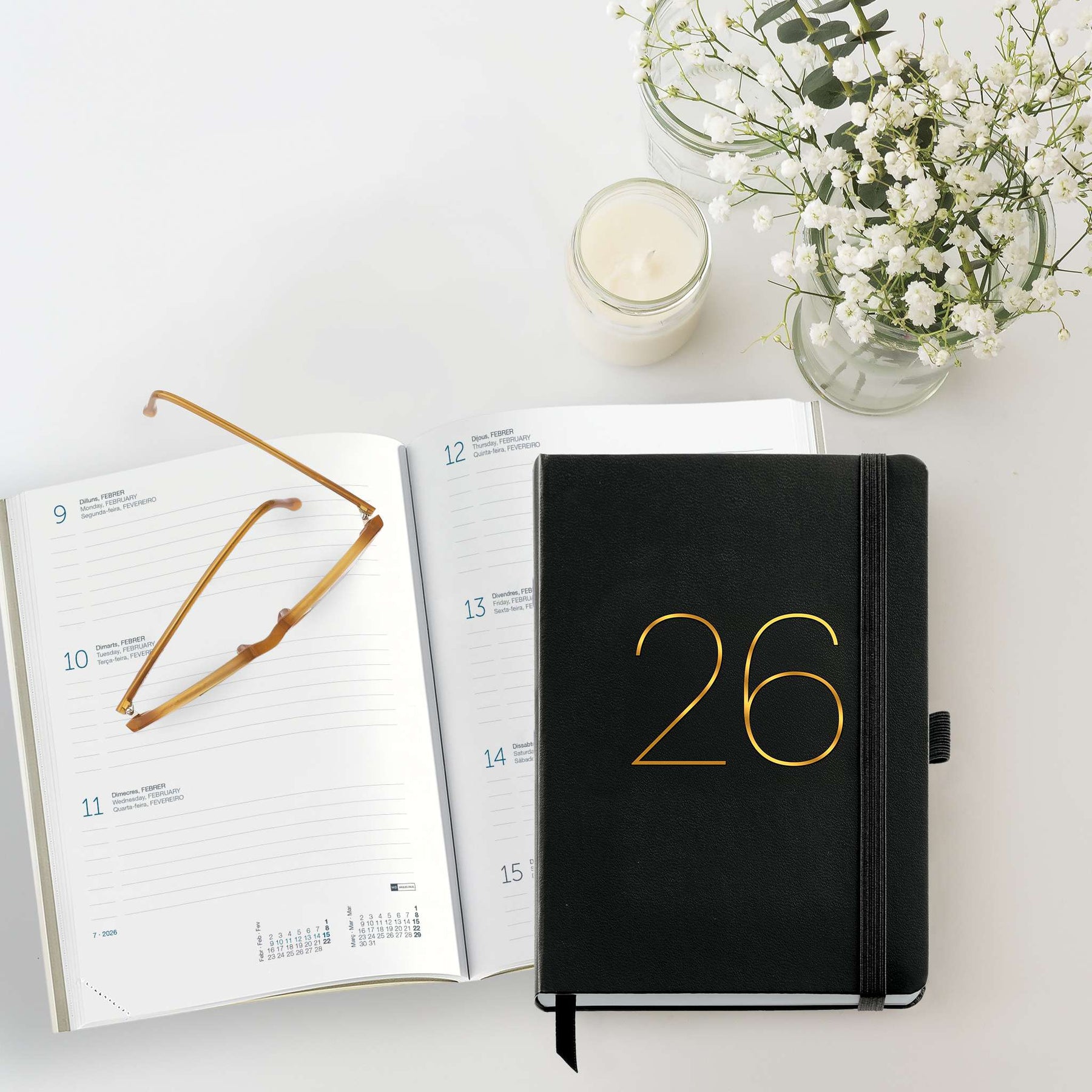 Cubiertas rígidas cosidas de símil piel (papel vinílico). Papel 80 g/m², FSC Mix Credit. Tamaño: Plus 155 x 213 mm. Anualidad: Semana a la vista (anualidad horizontal S/V), de Enero a Diciembre 2026. Idiomas: Catalán - Inglés - Portugués. Encuadernación cosida con cinta marcador. Bolsillo interior. Goma elástica para cerrar. Goma portabolígrafos. Contenido: Anualidad semana a la vista horizontal, hoja de datos personales, calendarios 3 años, calendario bimensual en cada doble página, recomendaciones, fechas a recordar, planning mensual, hojas para notas y hojas para direcciones. Festivos nacionales y portugueses. Iconos que indican: cambio horario, inicio estaciones, año nuevo chino, carnaval y lluvia de estrellas (entre otros). En versión catalán: Festivos Cataluña y sus capitales de provincia.