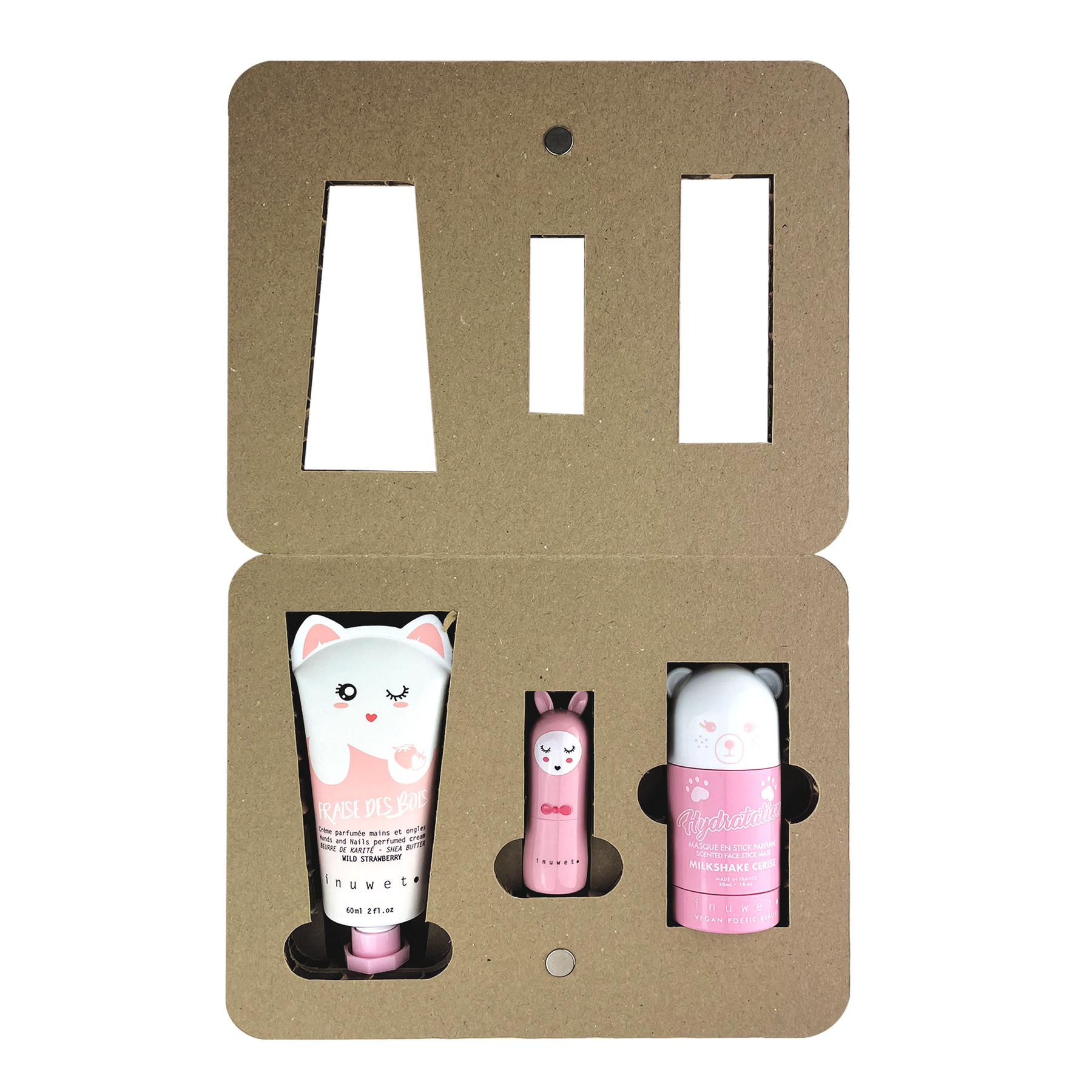 Compuesto por un bálsamo labial de fresa, una crema de manos de fresa y una mascarilla facial en barra de arcilla hidratante con aroma a cereza.