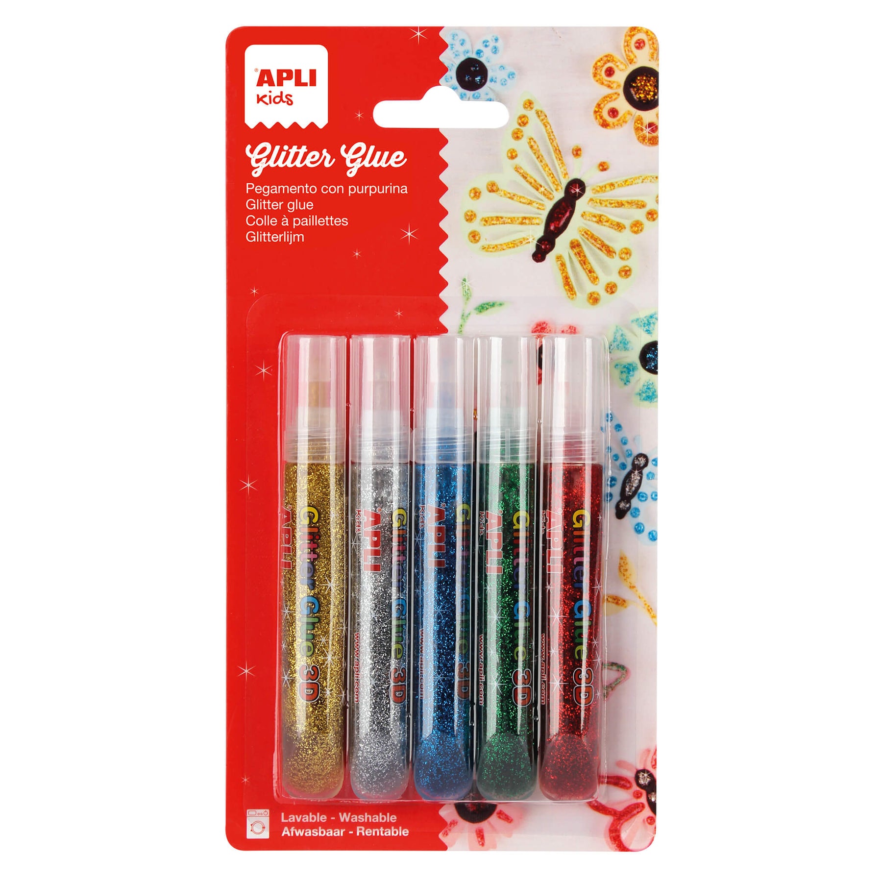 Pegamento con purpurina de colores surtidos metalizados: oro, plata, azul, verde y rojo. El pack contiene 5 botes, uno por color, de 13 g cada uno. Producto de fácil uso gracias a su tubo blando y a la punta dosificadora, que permite una aplicación de mayor precisión. Ideal para ser usado como pegamento o para decorar: aplicar directamente sobre la superficie a decorar y dejar secar al aire durante mínimo 30 minutos. Recomendado para diferentes superficies: papel, cartón, goma EVA, vidrio, plástico, textil, madera o cerámica. Producto muy limpio, lavable a máquina en programas de agua caliente; seguro, no tóxico; y de larga duración, gracias al tapón anti-secado de que dispone.