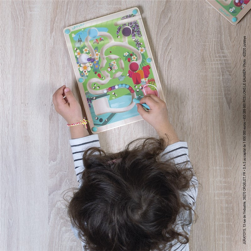 Desde la colmena, atraviesa el laberinto y lleva las 12 bolas de colores a la zona correspondiente con ayuda del lápiz magnético: azul para la charca, rojo para los tulipanes, etc. ¡Pero ten cuidado de coger bien la puerta giratoria para no quedarte atascado! Certificado del FSC.