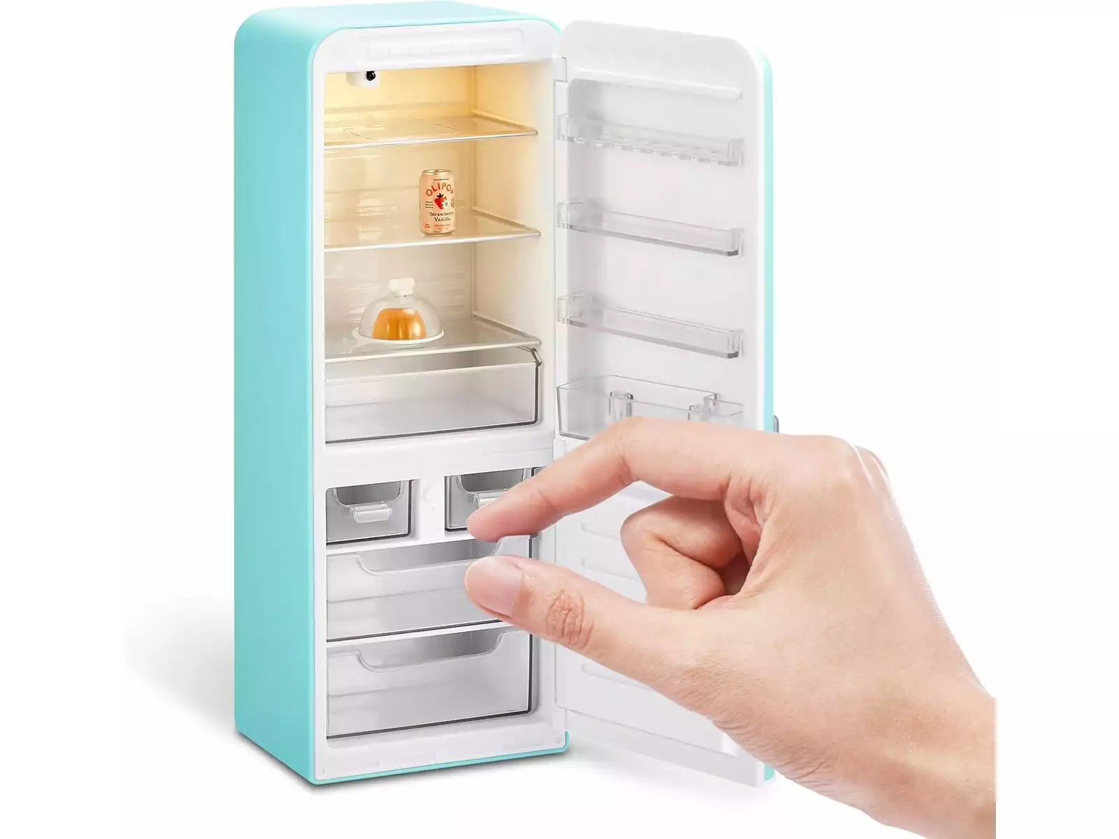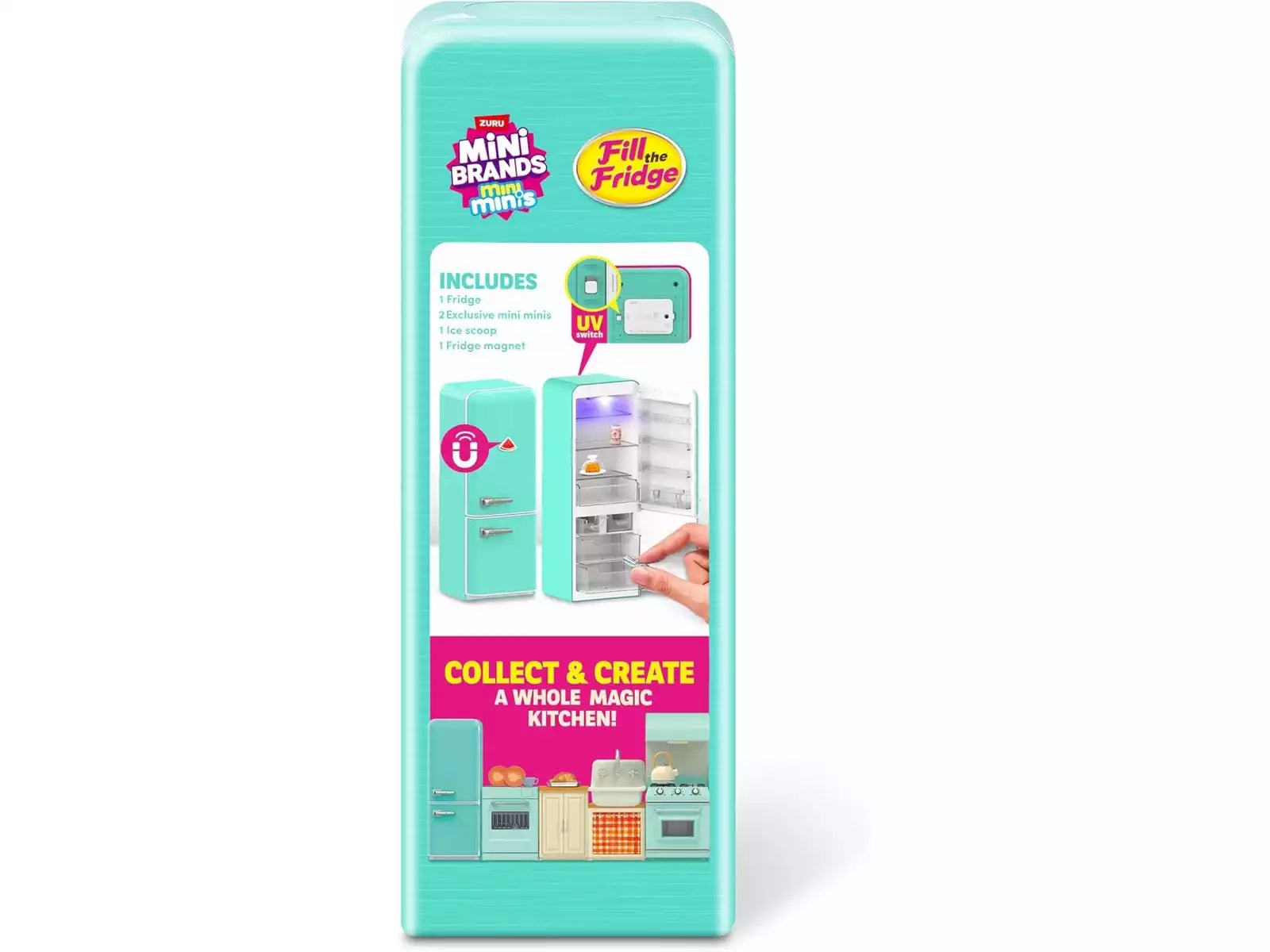Incluye: 1 Frigorífico Mini Brands Mini Minis de color azul con dos puertas, varios espacios en su interior, luz UV y más detalles geniales, 1 imán para la nevera, 1 cuchara para hielo y 1 miniatura exclusiva.