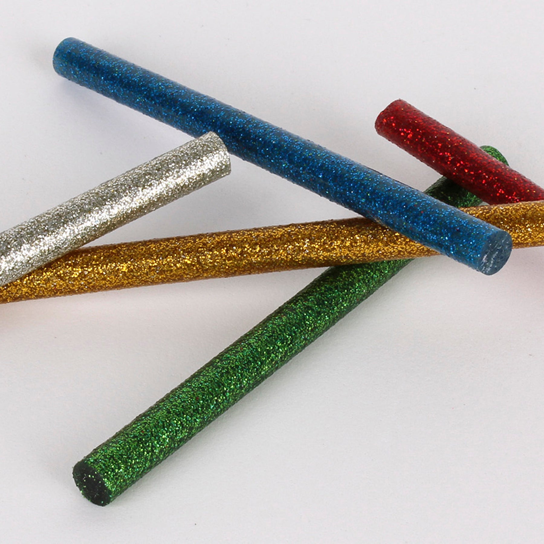 Recambio de 12 barras de cola de adhesivo termofusible de Ø7,5 mm x 10 cm en colores surtidos con purpurina. 5 colores surtidos con acabado purpurina: 3 barras oro, 3 barras plata, 2 barras rojo, 2 barras verde, 2 barras azul. Compatibles con pistolas de cola para barras de Ø7,5 mm. El complemento más eficaz y profesional para realizar tus pequeños trabajos de bricolaje en el hogar y manualidades. Su composición permite obtener una gran precisión y limpieza en los trabajos realizados, de una manera fácil y segura. Barras de adhesivo hot melt que no gotea. Aplicación de adhesión instantánea en multitud de superficies: madera, plástico, cerámica, metal, piel, textil, goma EVA, fieltro, cartón y otros muchos productos. Las barras de cola en color son perfectas para añadir un toque distintivo y para crear decoraciones. Después de aplicar, dejar actuar entre 20 y 30 segundos. Compatibles con la mayoría de pistolas del mercado.