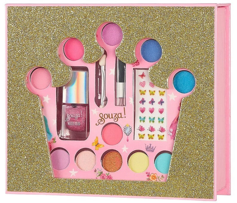 Descubre la Souza Caja de regalo corona, una preciosa caja decorada con purpurina dorada que encanta a los más pequeños. Está llena de maquillaje infantil a base de agua, ideal para que los niños jueguen y se diviertan de forma segura.